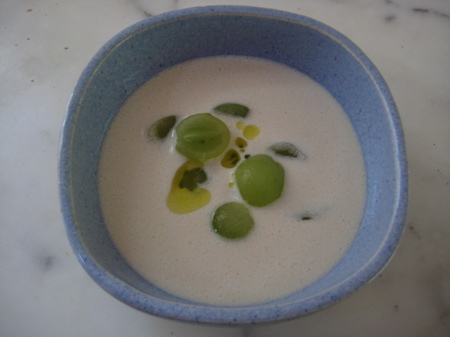 Ajoblanco would translate as something like "white garlic," and this being one of the traditional cold soups of Andalucía, it does include raw garlic. Its piquancy is tamed by the green flavors of extra virgin olive oil and grapes (or cubes of honeydew melon)—the overall effect is soothingly cool. The almonds add lots of body, so small first course servings are in order. Ajoblanco in shot glasses makes a nice liquid tapa for a busy stand-up gathering.