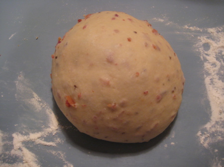 Bring the speed up to medium and let the mixer go for a good five or six minutes. Add the chopped greixons* and mix or knead them in well, for a minute or two.