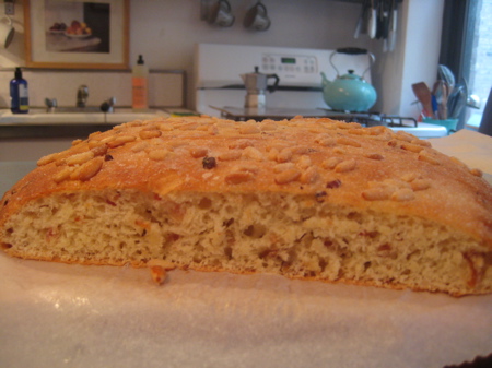 Coca de greixons is a simple one-rise brioche dough. The butter and eggs are dialed back a notch to compensate for the other gras, which you've slowly crisped so that it practically amounts to lean cuisine anyway. Roll it out into the traditional oblong coca shape, paint it with olive oil, and give it a scattering of sugar and pine nuts for crunch, and voila! Or, as I believe I said at my first confession: Je regrette rien.