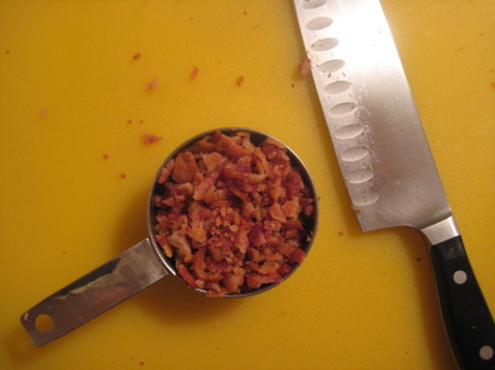 Cook the bacon over low heat, stirring frequently. You want it evenly rendered and caramelized. You'll end up with at least a half cup of bacon fat as a handy by-product.
