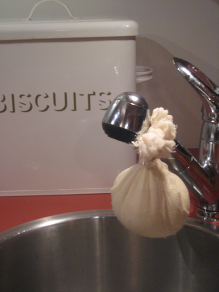 Now gather up the corners of your cheesecloth and tie it with a piece of kitchen twine or a rubber band. Tie the bundle to your faucet and let it drip into your sink for 20 minutes. Don't let it go much longer or it gets too dry.