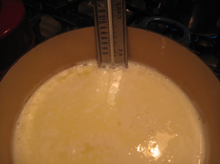 If you're a Catalan countrywoman you probably know by looking just when to turn off the fire. It's not too far south of the boiling point, when the milk is wiggly and threatening to simmer, that you'll see the milk seem to separate a bit, and a few curds begin to form. I use a candy thermometer and this all happens between 170 and 180 degrees F.